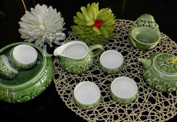 【品名】新绿釉凹雕15头尖脚杯功夫茶具组