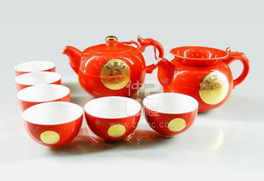 【品名】红釉万事如意圆茶壶新茶杯10头茶具组