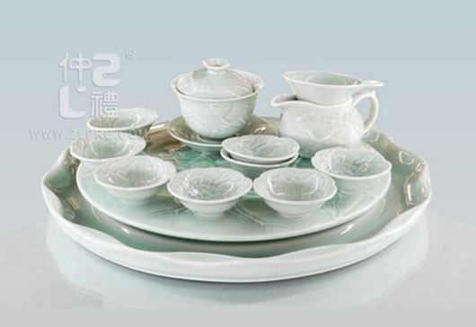 【品名】浅绿釉浮雕荷花15头14转盘功夫茶具组