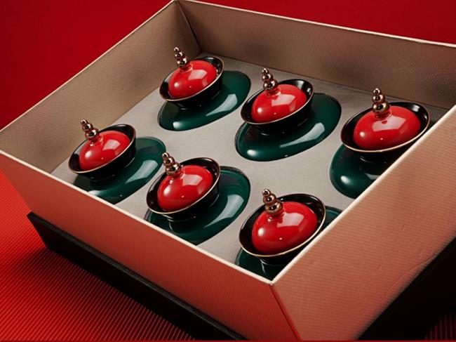 宫之意在于当今正统,元素源于清朝官帽。意欲传达官方正统之诚心、诚信。再以色釉撞色工艺突出产品特点,以红色为首,以金封顶。寓意红顶节节高之意。