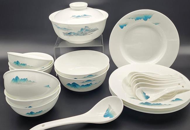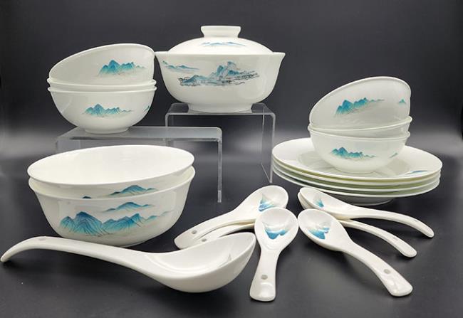 配置:6* 4.5寸米饭碗 ,6* 小调羹 ,4* 8寸菜盘,2* 7寸深汤碗,1+1* 带盖汤碗,1* 大汤勺
