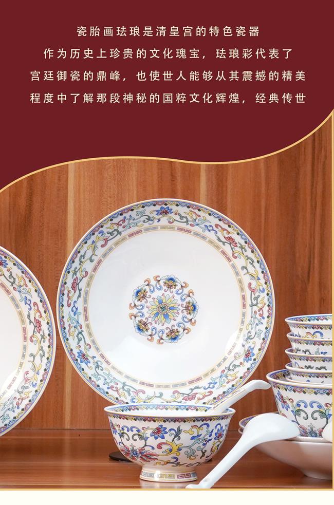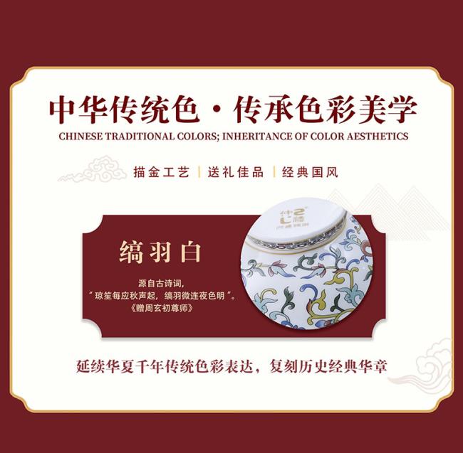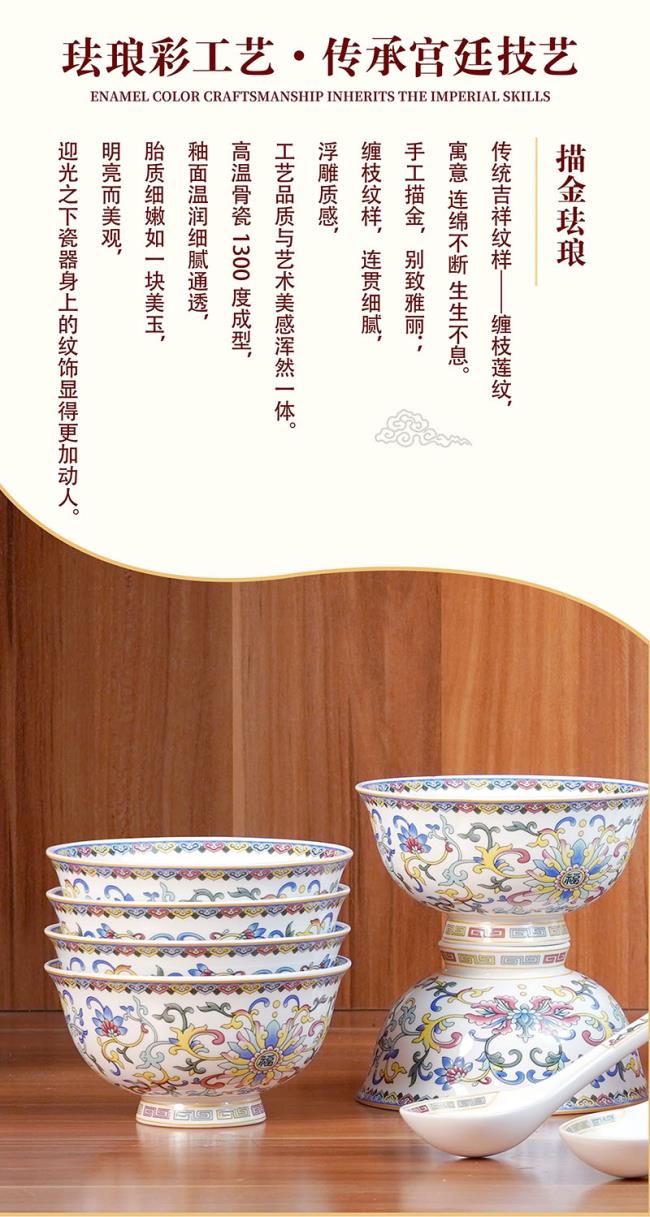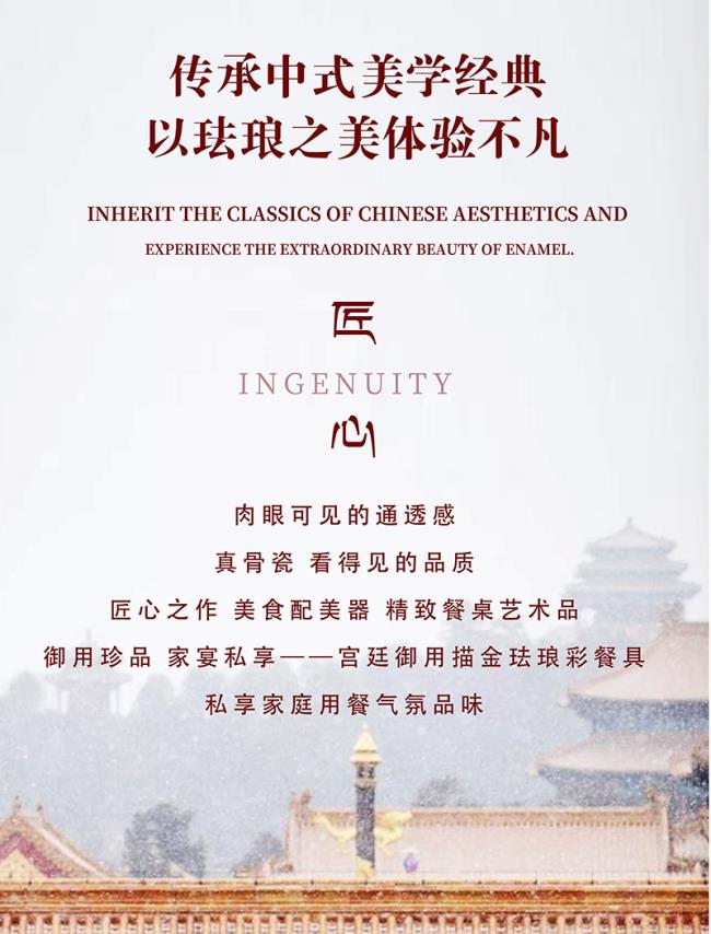 传承中式美学经典,以珐琅之美体验不凡。瓷胎画珐琅是清皇宫的特色瓷器,作为历史上珍贵的文化瑰宝,珐琅彩代表了宫廷御瓷的鼎峰,也使世人能够从其震撼的精美程度中了解那段神秘的国粹文化辉煌,经典传世。中华传统色,传承色彩美学,延续华夏千年传统色彩表达,复刻历史经典华章。珐琅彩工艺,传承宫廷技艺,描金珐琅,传统吉祥纹样——缠枝莲纹,寓意 连绵不断 生生不息。手工描金,别致雅丽;缠枝纹样,连贯细腻,浮雕质感,工艺品质与艺术美感浑然一体。高温骨瓷1380度成型,釉面温润细腻通透,胎质细嫩如一块美玉,明亮而美观,迎光之下瓷器身上的纹饰显得更加动人。匠心之作,美食配美器,精致餐桌艺术品,御用珍品,家宴私享。