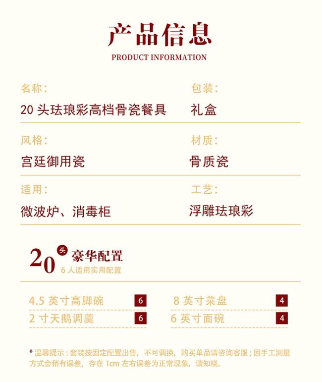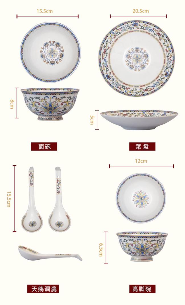配置:6x 4.5寸高脚碗,6x 2寸天鹅调羹,4x 8寸菜盘,4x 6寸面碗.