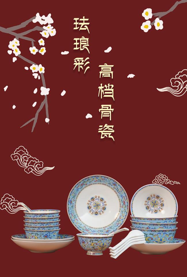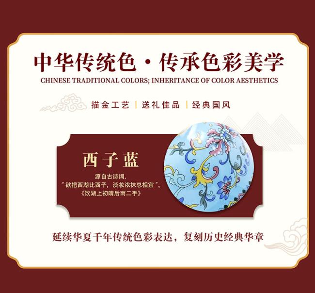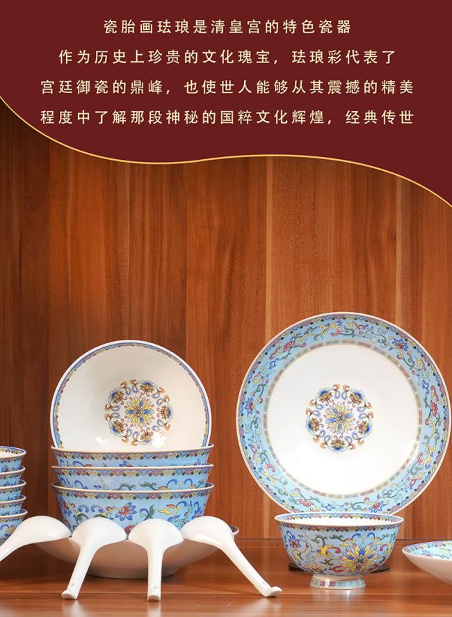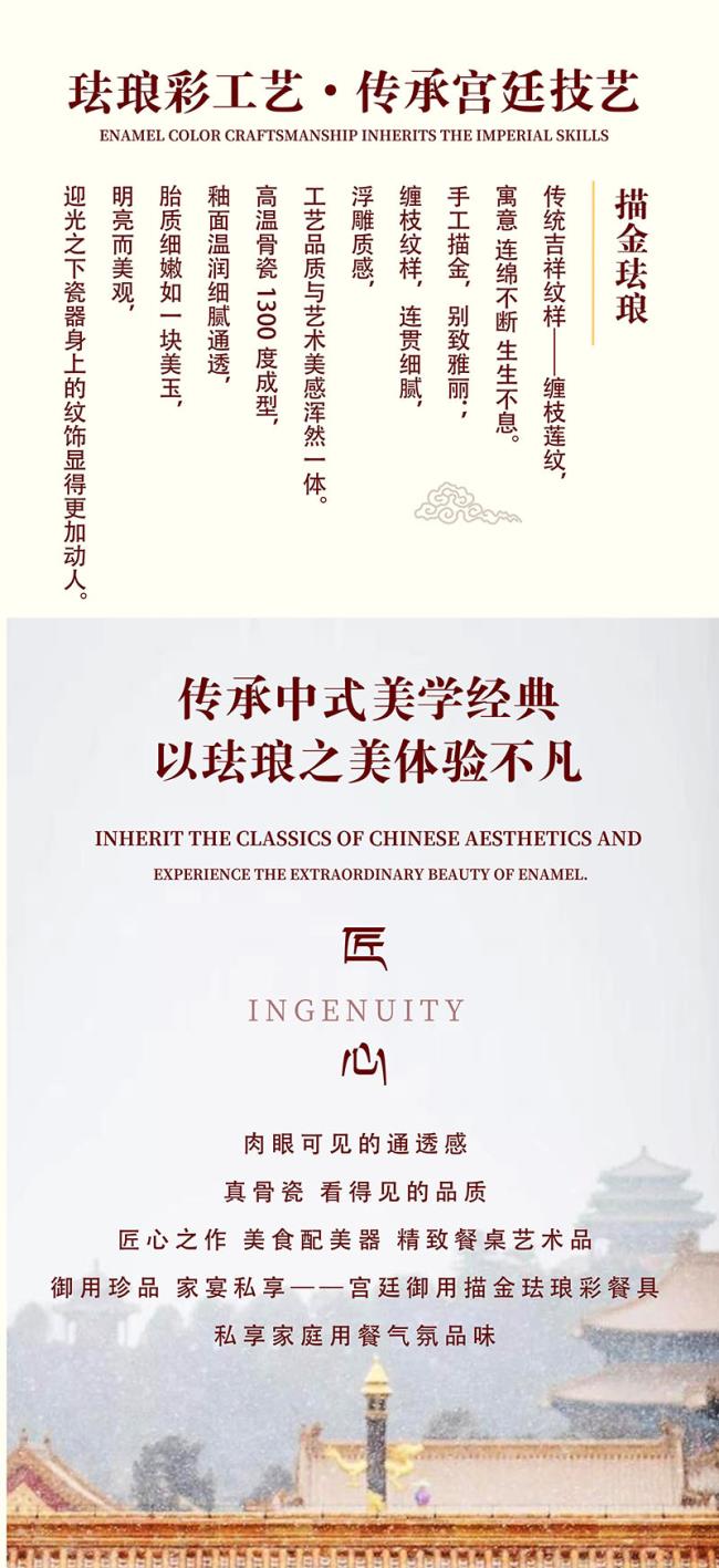 传承中式美学经典,以珐琅之美体验不凡。瓷胎画珐琅是清皇宫的特色瓷器,作为历史上珍贵的文化瑰宝,珐琅彩代表了宫廷御瓷的鼎峰,也使世人能够从其震撼的精美程度中了解那段神秘的国粹文化辉煌,经典传世。中华传统色,传承色彩美学,延续华夏千年传统色彩表达,复刻历史经典华章。珐琅彩工艺,传承宫廷技艺,描金珐琅,传统吉祥纹样——缠枝莲纹,寓意 连绵不断 生生不息。手工描金,别致雅丽;缠枝纹样,连贯细腻,浮雕质感,工艺品质与艺术美感浑然一体。高温骨瓷1380度成型,釉面温润细腻通透,胎质细嫩如一块美玉,明亮而美观,迎光之下瓷器身上的纹饰显得更加动人。匠心之作,美食配美器,精致餐桌艺术品,御用珍品,家宴私享。