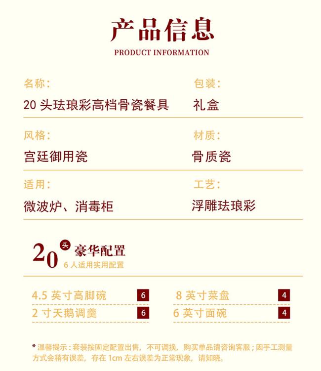 配置:6x 4.5寸高脚碗,6x 2寸天鹅调羹,4x 8寸菜盘,4x 6寸面碗.